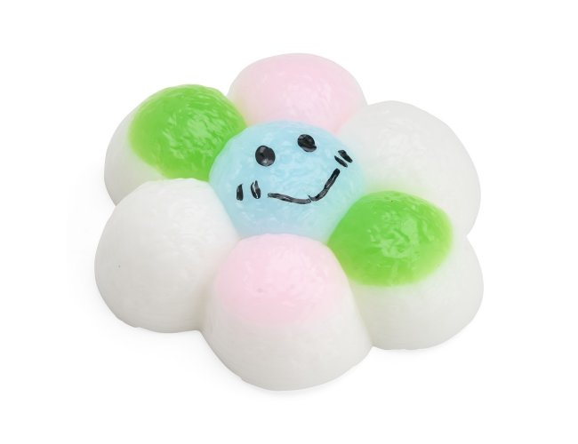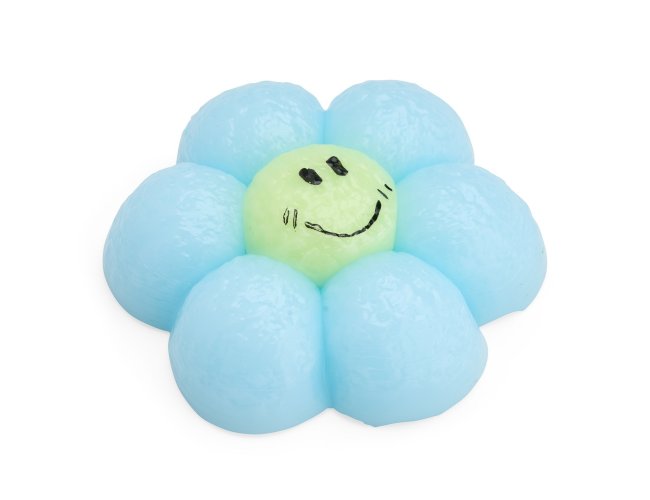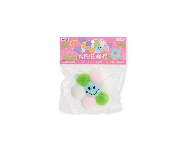 Brinquedo apertável antiestresse em formato de flor. Produzido em borracha termoplástica com superfície lisa e macia, adere facilmente a superfícies planas e acompanha bolinhas de pelúcia, além de lantejoulas para decoração.