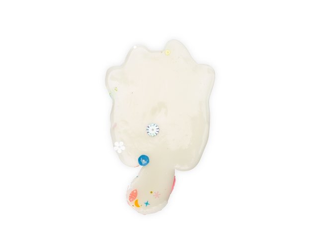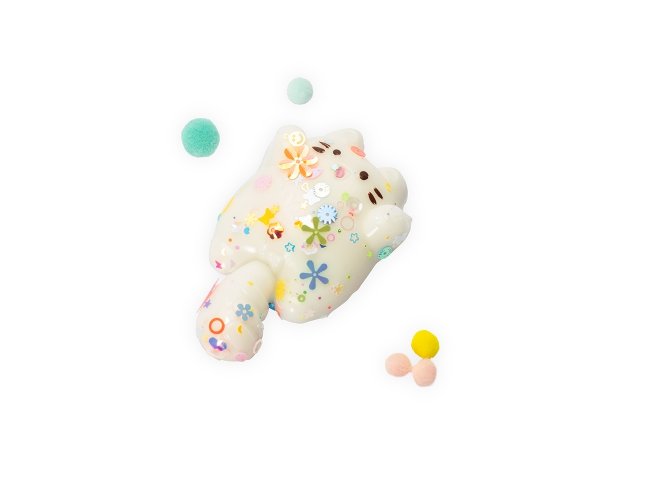 Brinquedo apertável antiestresse em formado de gato. Feito em borracha termoplástica com textura macia, adere facilmente a superfícies planas e acompanha bolinhas de pelúcia e lantejoulas para decoração.