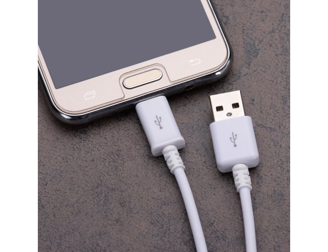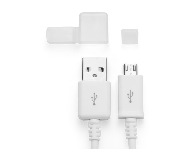 Cabo de dados V8/Android, acompanha proteções plásticas - proteção USB com suporte para encaixe do cabo.