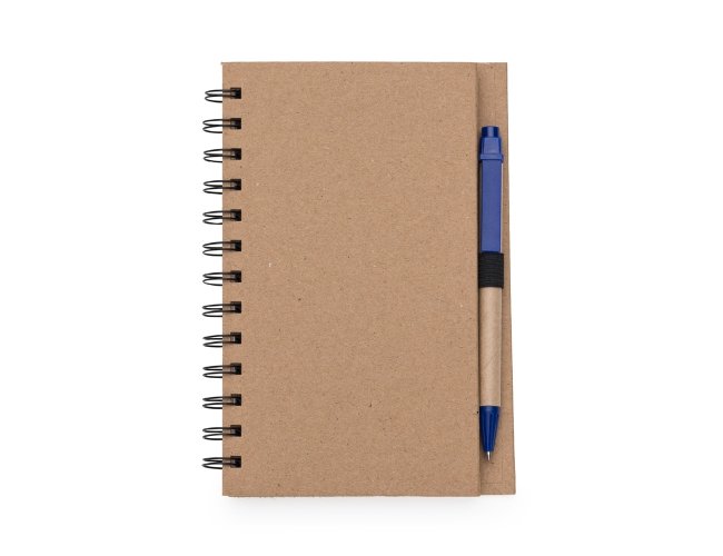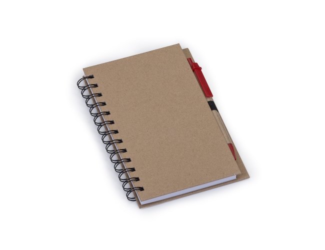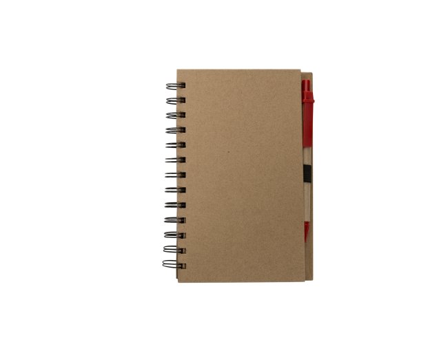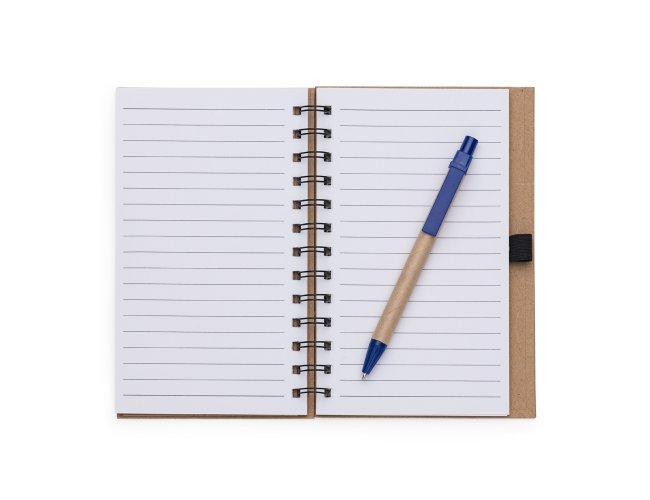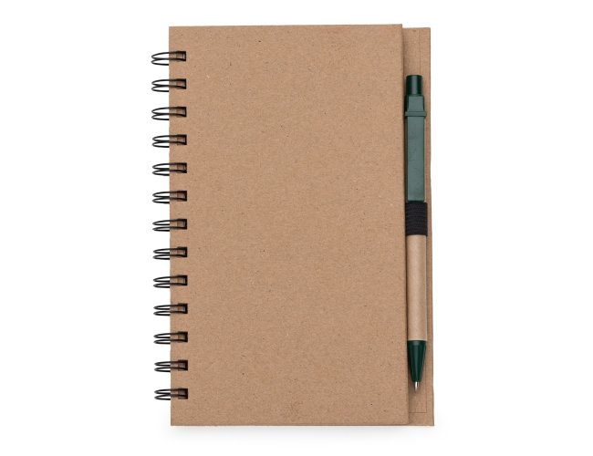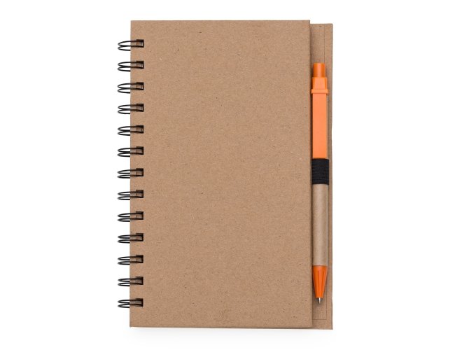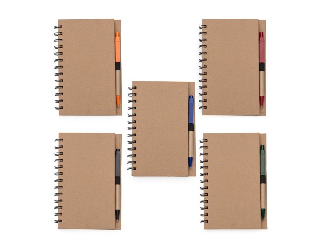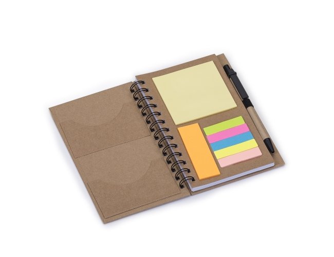 Caderneta ecológica com caneta e autoadesivos. Com dois suporte internos para cartão, possui cinco blocos autoadesivos com 20 folhas cada, bloco laranja e bloco amarelo com aproximadamente 20 folhas cada. Possui aproximadamente 70 folhas brancas pautadas e caneta de papelão de clip e ponteira plástica.