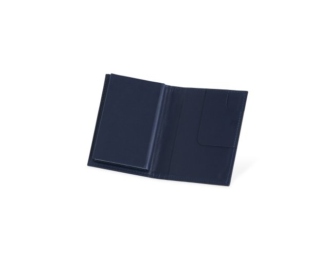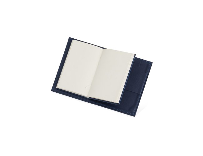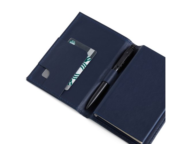 Caderneta em couro sintético com porta caneta e compartimento para arquivar folhas. Possui aproximadamente 80 folhas marfim sem pauta.