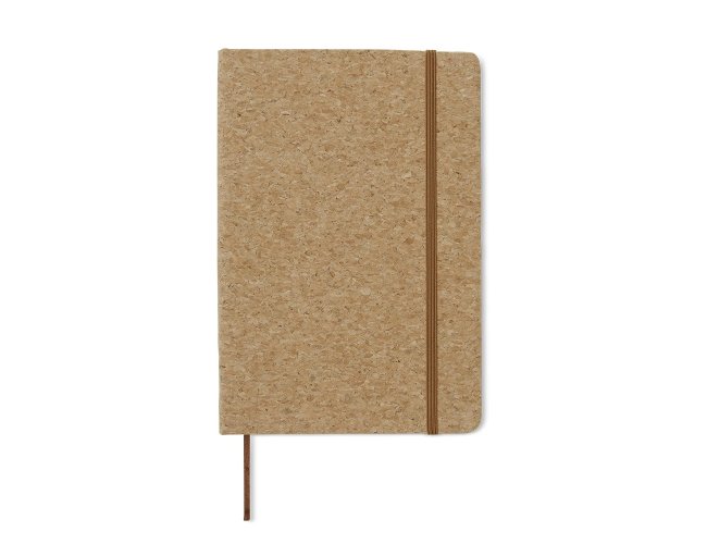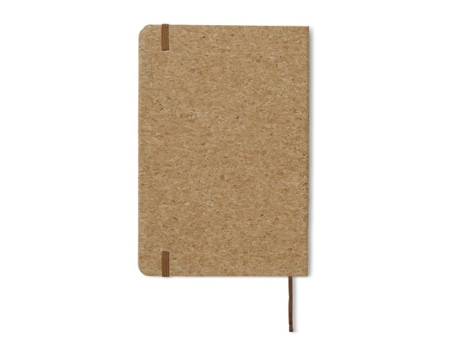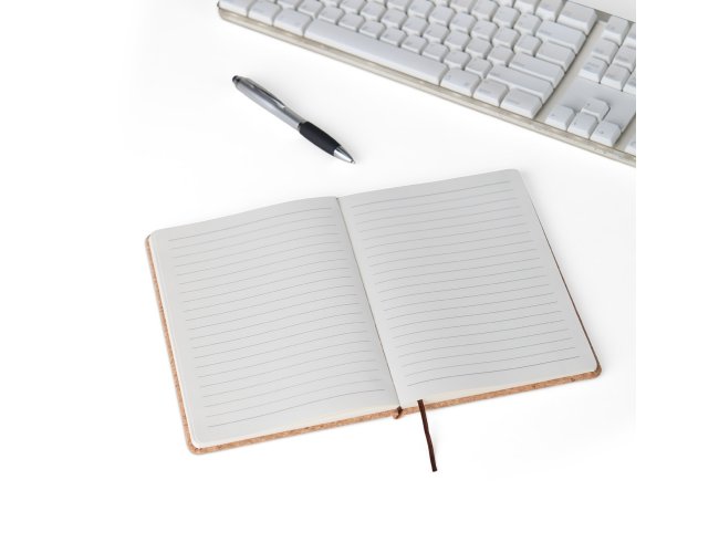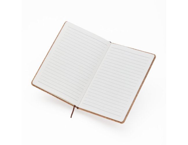 Caderneta de cortiça, contém aproximadamente 80 folhas amarelas com pauta, marcador de página em cetim e elástico para lacre.