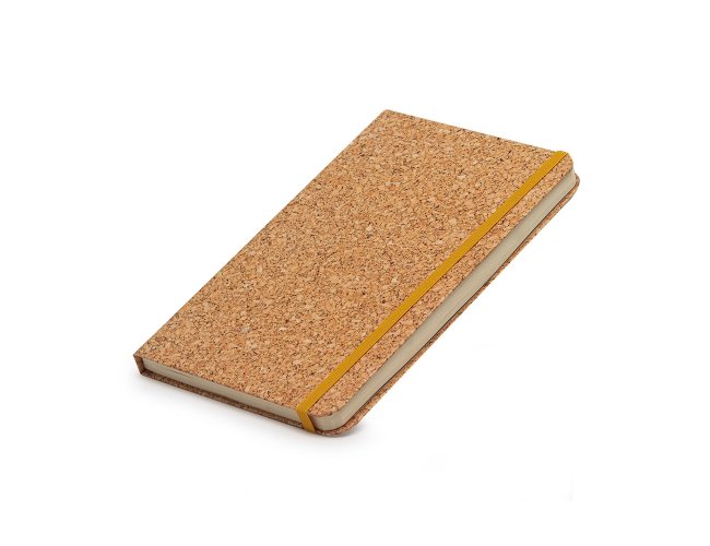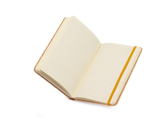 Caderneta em papel couche 150g, contém aproximadamente 72 folhas amarelas com pauta e 16 folhas sem pauta, marcador de página em cetim, elástico para lacre e compartimento em papel para documentos ou anotações.