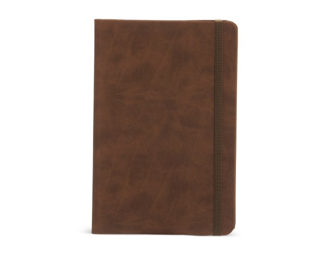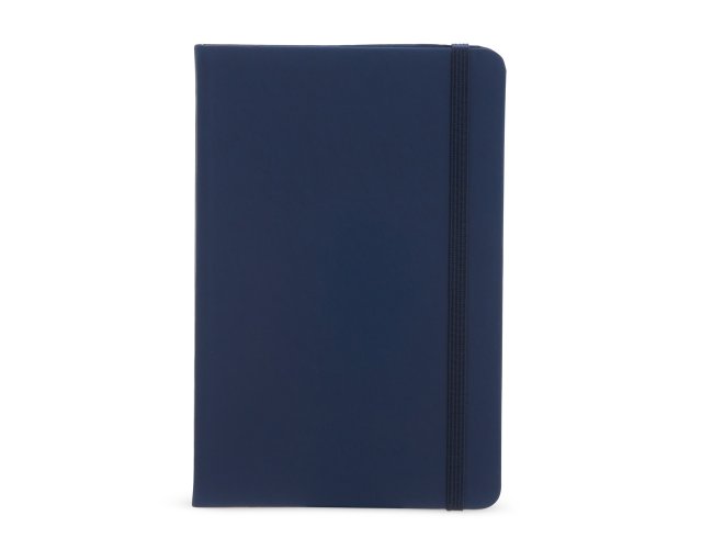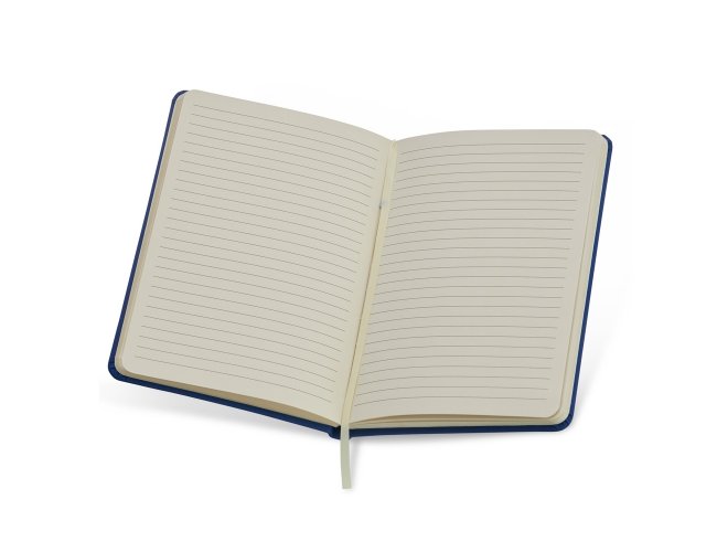 Caderneta em couro sintético emborrachado, possui marca página em cetim e elástico para lacre. Contém aproximadamente 80 folhas marfim pautadas.