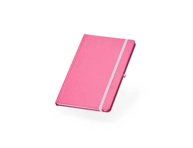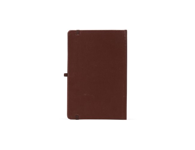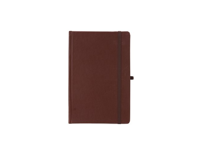 Caderneta de couro sintético com suporte para caneta, elástico para lacre e marcador de página em cetim, contém aproximadamente 80 folhas com pauta na cor branca.