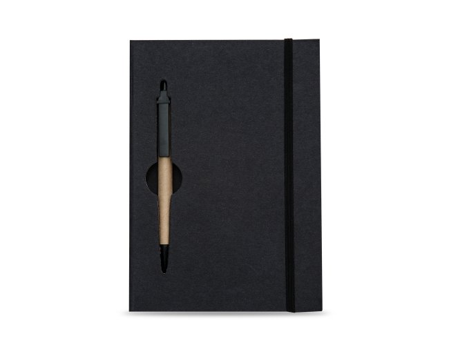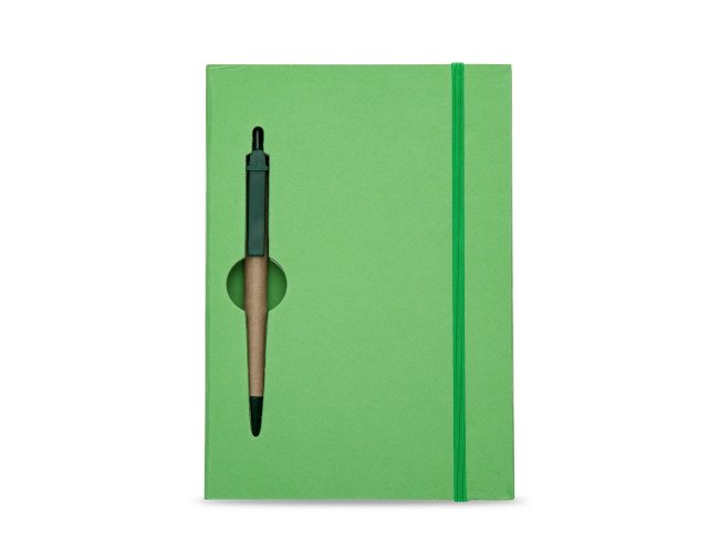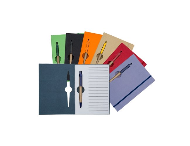 Caderneta ecológica com capa e miolo vazados, utilizados como suporte para a caneta. Bloco com miolo de picote, elástico para lacre e caneta de papelão com detalhes plásticos, carga esferográfica na cor azul e acionamento por clique.