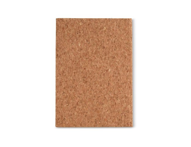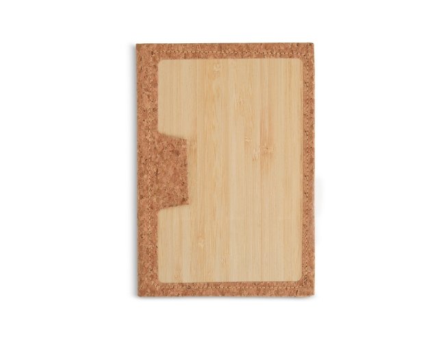 Caderneta de bambu com detalhe em cortiça. Possui aproximadamente 96 folhas brancas pautadas e suporte para caneta.