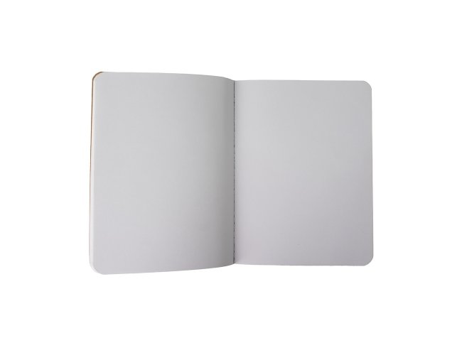 Caderneta em material kraft, frente e verso liso com fita elástica para fechar. Contém aproximadamente 70 folhas brancas sem pauta.