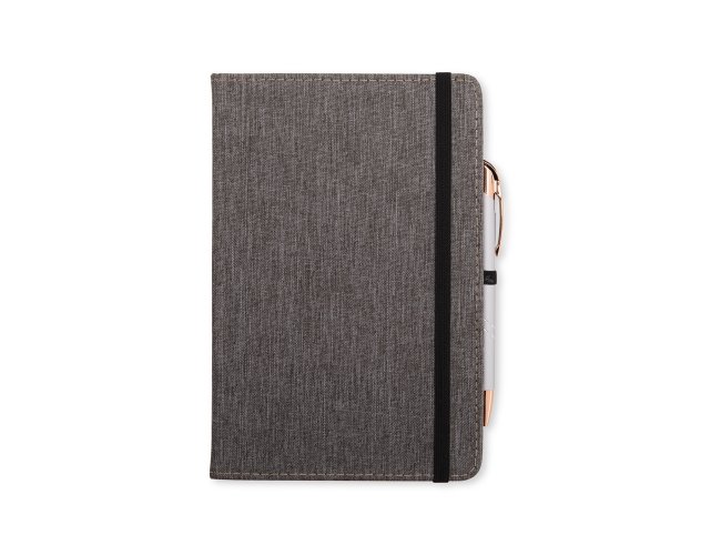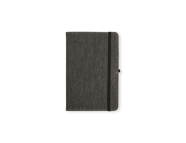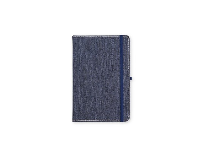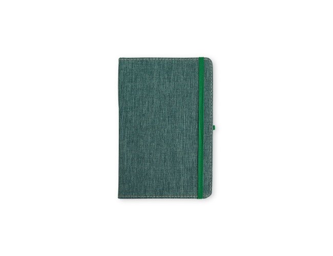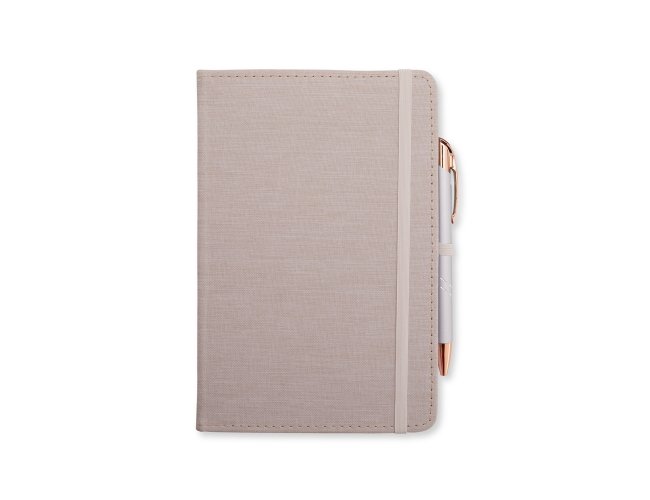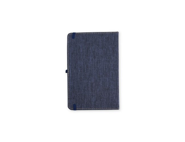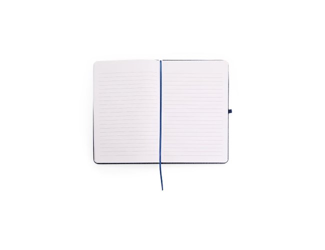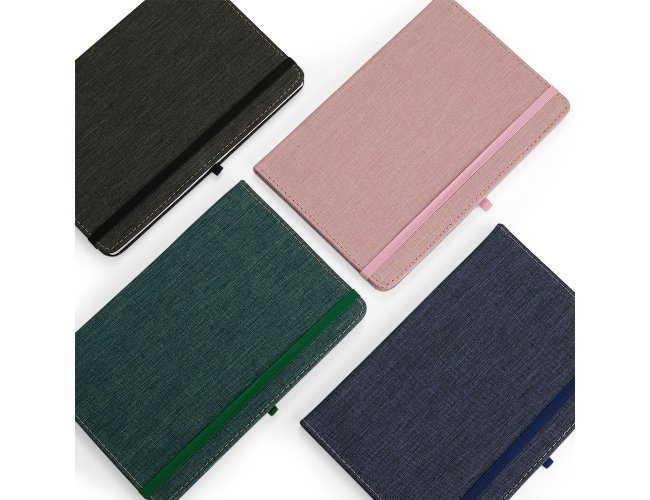 Caderneta com capa dura em linho, fechamento em elástico, marca-páginas em fita de cetim e porta-caneta elástico. Possui cerca de 80 folhas brancas pautadas.