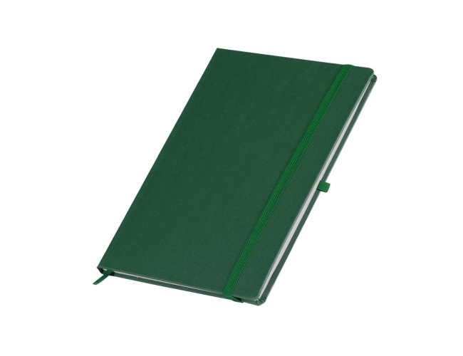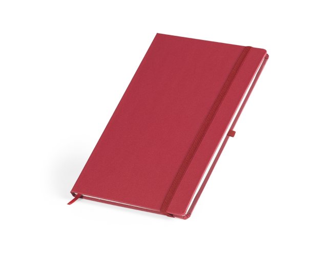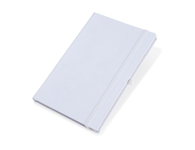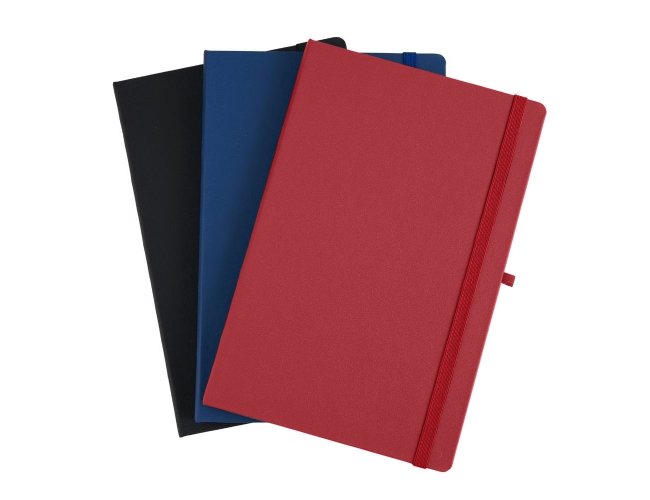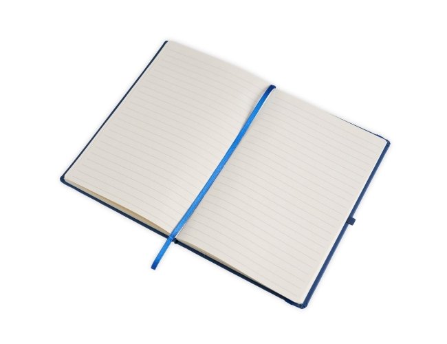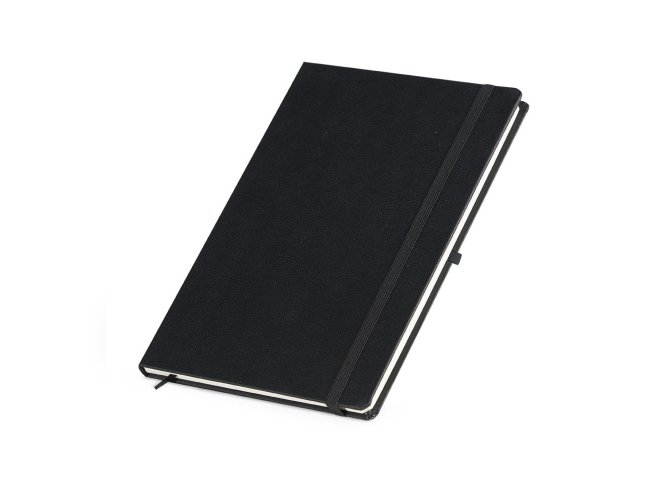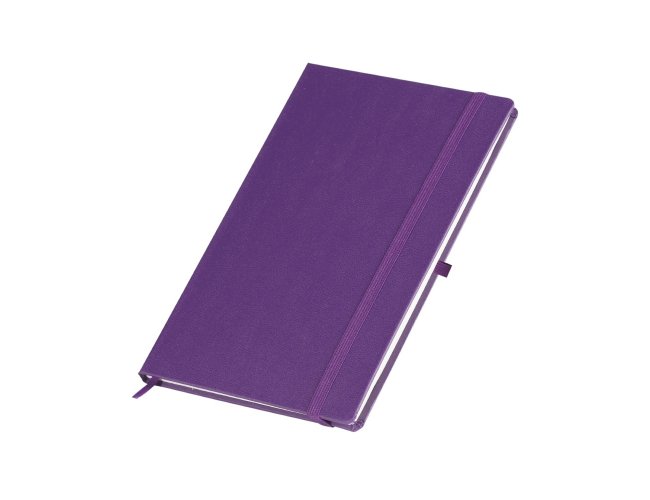 Caderneta em percalux com porta caneta, marcador de página em cetim e fita elástica para fechar. Contém aproximadamente 80 folhas com pauta.