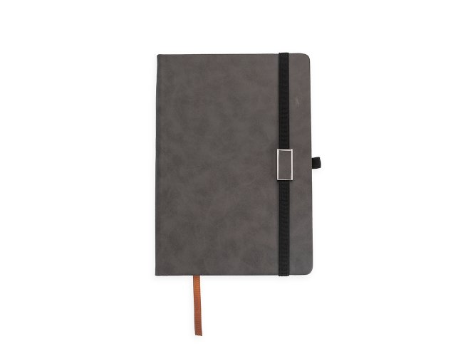 Caderneta emborrachada com suporte para caneta. Contém aproximadamente 96 folhas amarelas sem pauta, suporte de nylon para caneta (não acompanha), marcador de página em cetim e elástico para lacre com plaquinha de centro emborrachado.