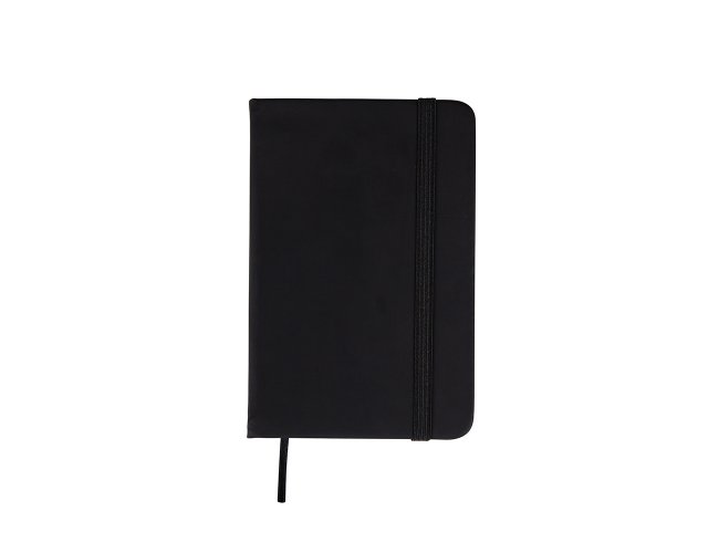 Caderneta emborrachada com marcador de página em cetim e fita elástica para fechar. Contém aproximadamente 80 folhas amareladas com pauta.