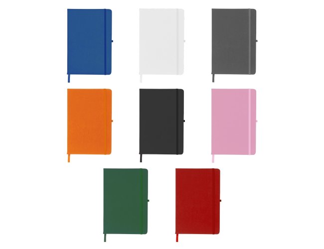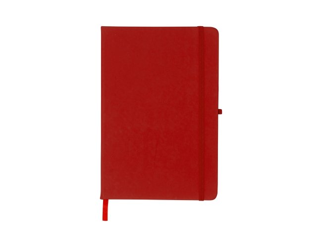 Caderneta emborrachada com porta caneta elástico em nylon, marcador de página em cetim e fita elástica de nylon para fechar. Contém aproximadamente 80 folhas pardas pautadas.