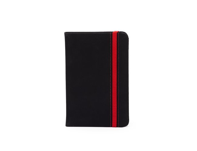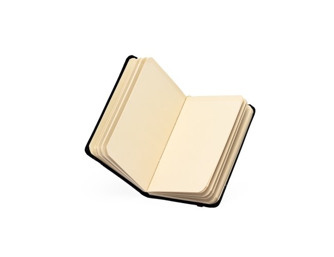 Caderneta emborrachada com marcador de página em cetim e fita elástica de nylon para fechar. Contém aproximadamente 78 folhas marfim sem pautas.