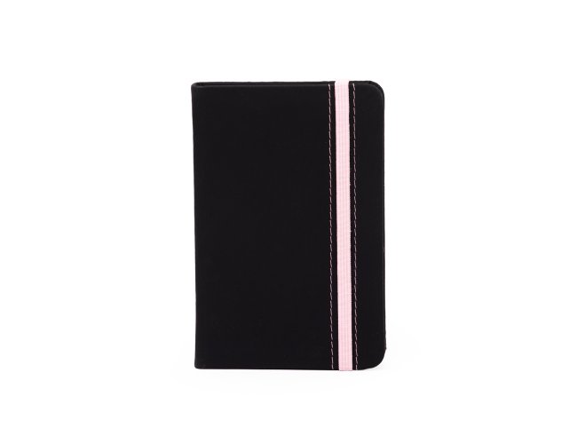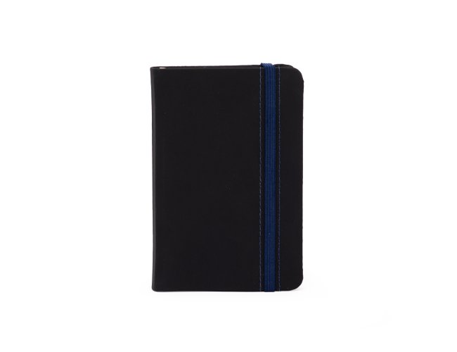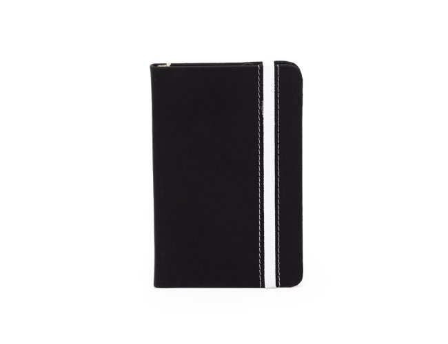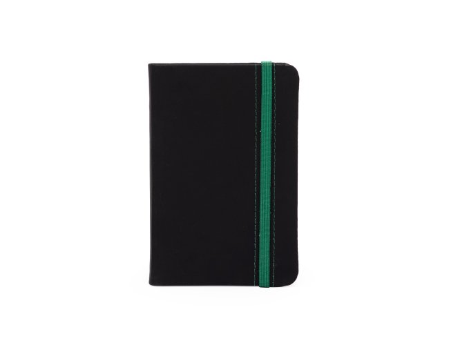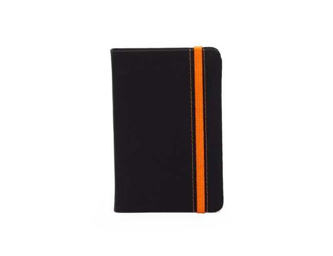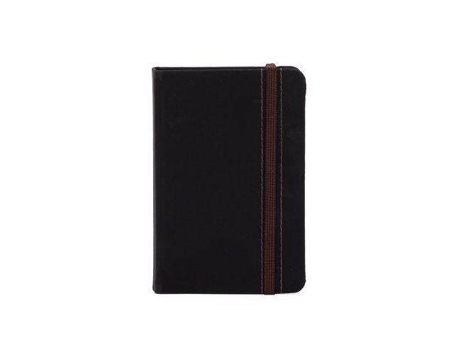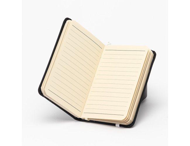 Caderneta emborrachada com marcador de página em cetim e fita elástica de nylon para fechar. Contém aproximadamente 78 folhas marfim pautadas.