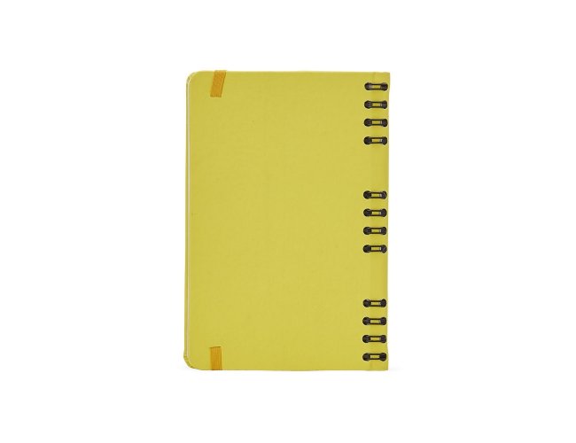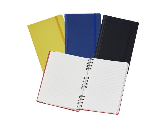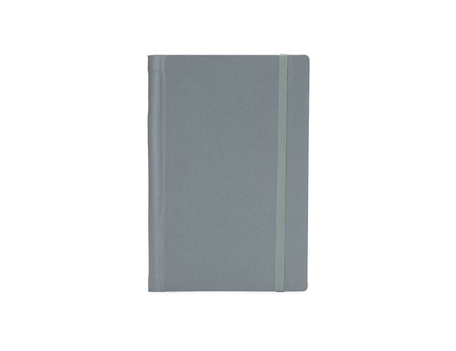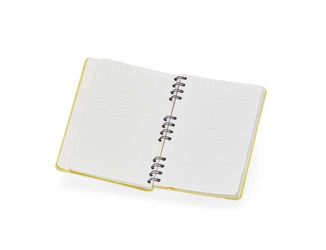 Caderneta emborrachada com wire-o, elástico para lacre e marcador de página em cetim. Possui páginas para dados pessoais, calendário de 2024 à 2026, página de contatos e aproximadamente 100 páginas em marfim com pauta.