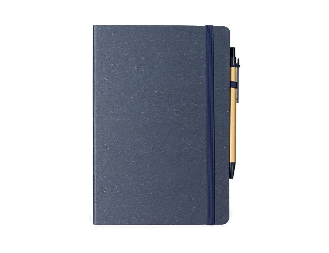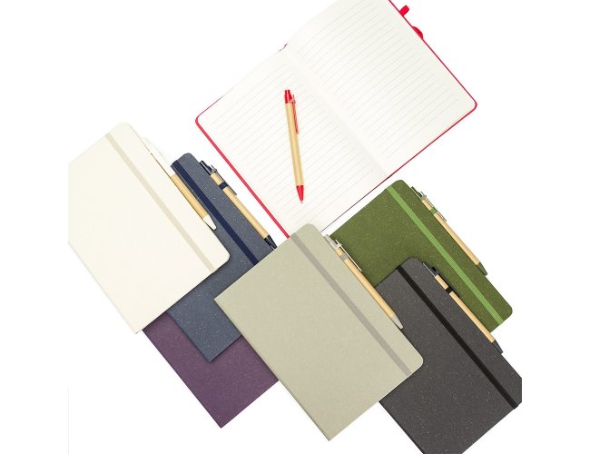 Caderneta ecológica com capa em fibra da palha de arroz. Contém aproximadamente 80 folhas amareladas com pauta, além de duas folhas de guarda, uma fita elástica para fechamento e porta-canetas em elástico. Acompanha uma caneta esferográfica de carga azul de 1,0mm com corpo em papelão e clip, acionamento por clique e ponteira em plástico.