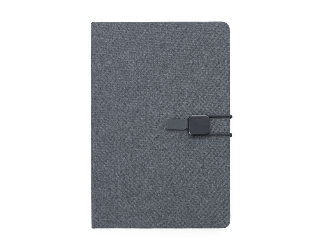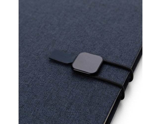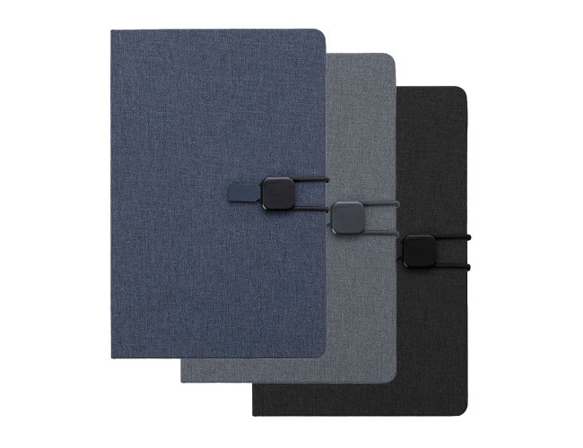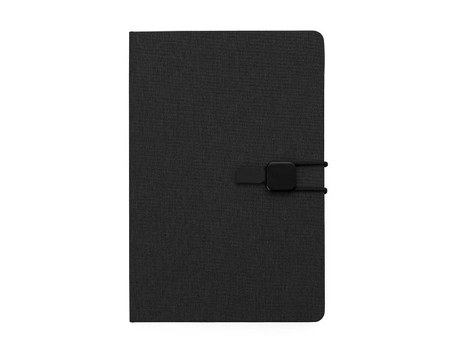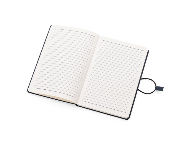 Caderneta capa dura em tecido de poliéster. Miolo com 80 folhas pautadas na cor bege. Possui elástico lateral com detalhe em couro sintético para fechamento do caderno.