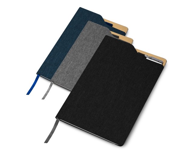 Caderneta com capa dura em RPET (PET Reciclado), com porta caneta e marca página em cetim. Contém aproximadamente 80 folhas com pauta.