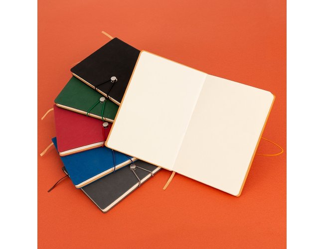 Caderneta com fecho de pino e elástico de nylon para lacre. Capa em material sintético emborrachado, possui aproximadamente 96 folhas pardas pautadas e marca página em cetim.