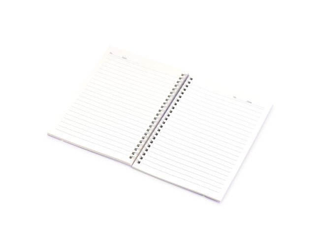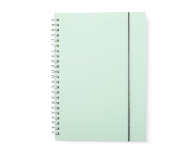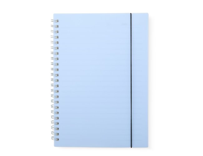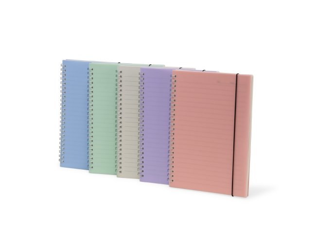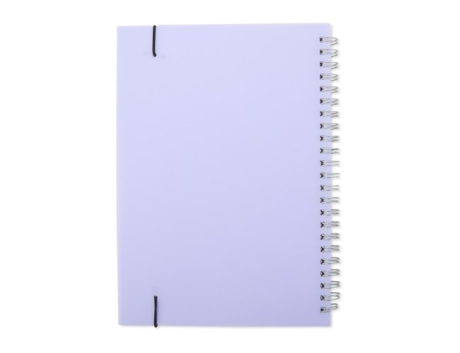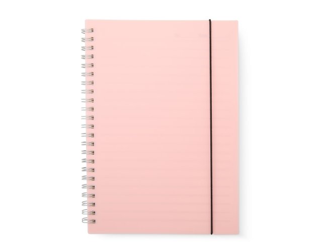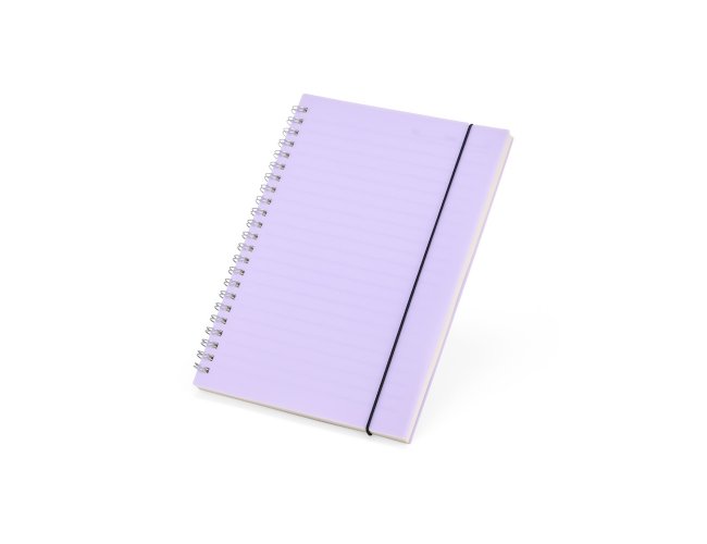 Caderno A5 com capa plástica e elástico para lacre, contém aproximadamente 80 folhas marfim com pauta.
