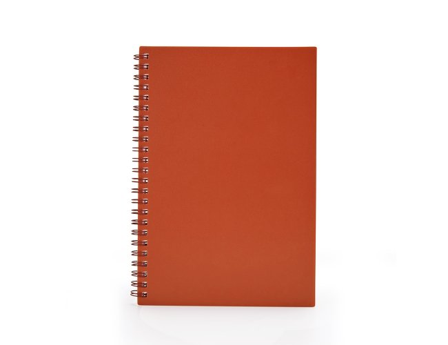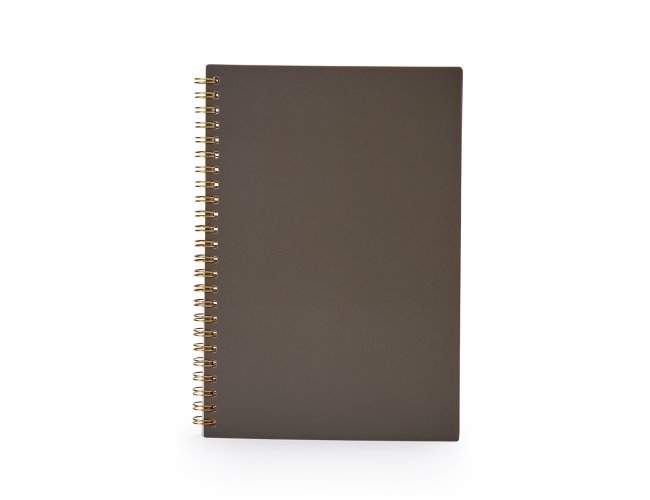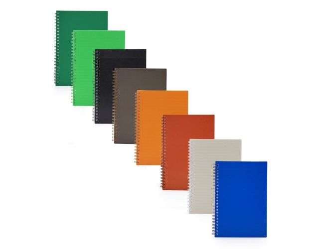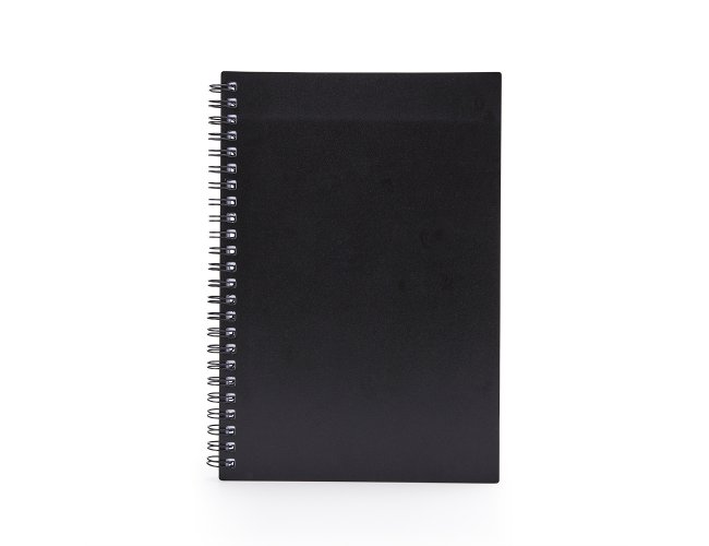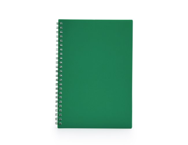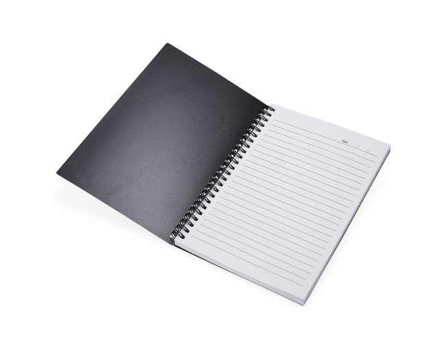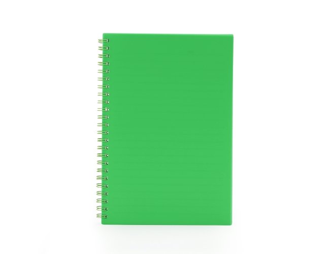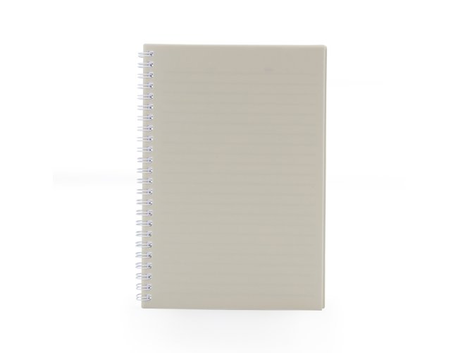 Caderno A5 plástico com wire-o metálico. Capa em PP, contém aproximadamente 80 folhas brancas com pauta.