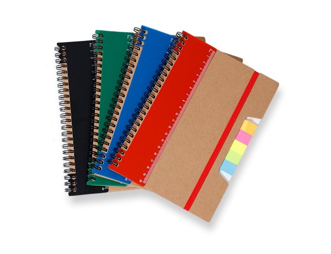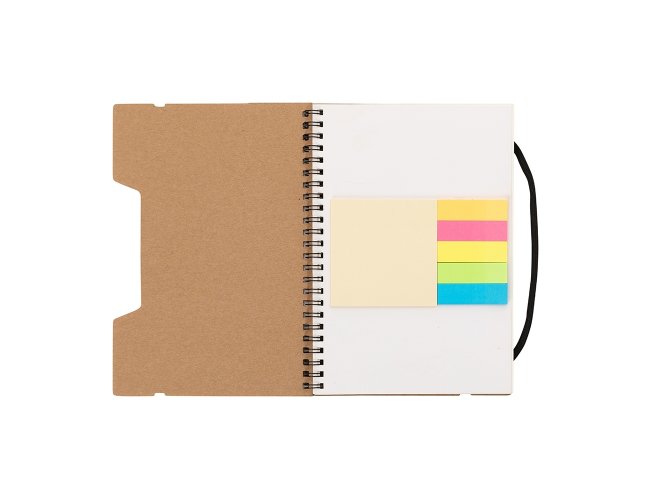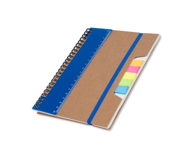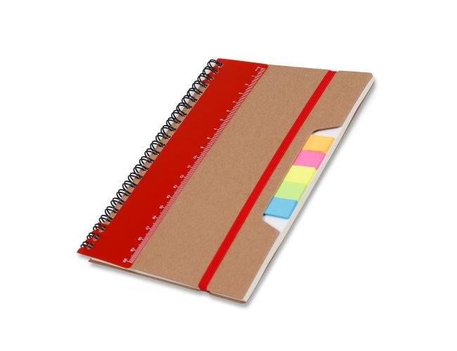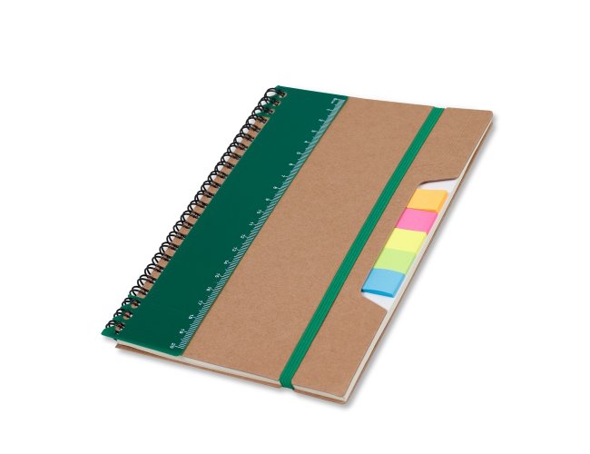 Caderno ecológico com autoadesivos e régua. Bloco com wire-o, elástico, e detalhes vazados na capa, contém conjunto de cinco bloquinhos autoadesivos coloridos, bloco autoadesivo para anotações e 70 folhas pautadas.