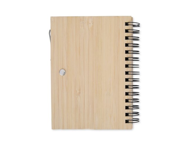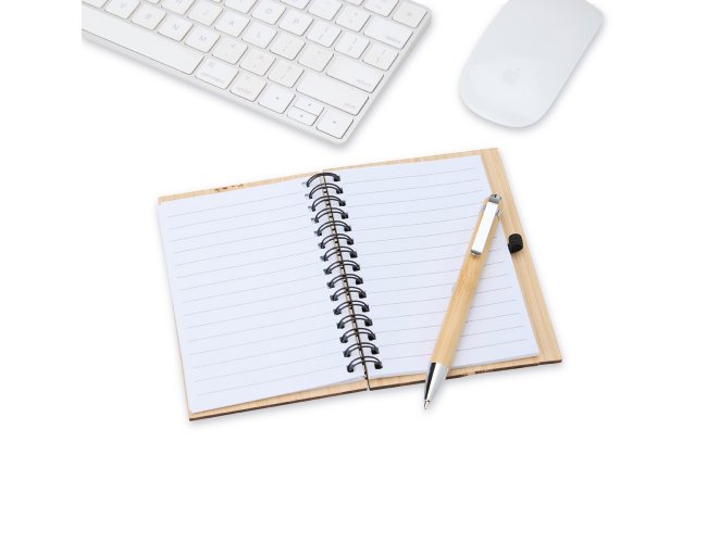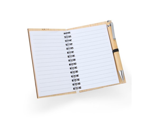 Caderno ecológica com caneta. Capa de bambu. Possui aproximadamente 50 folhas brancas pautadas. Acompanha uma caneta de bambu com detalhes em metal.