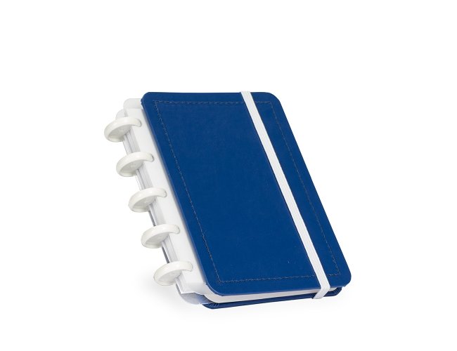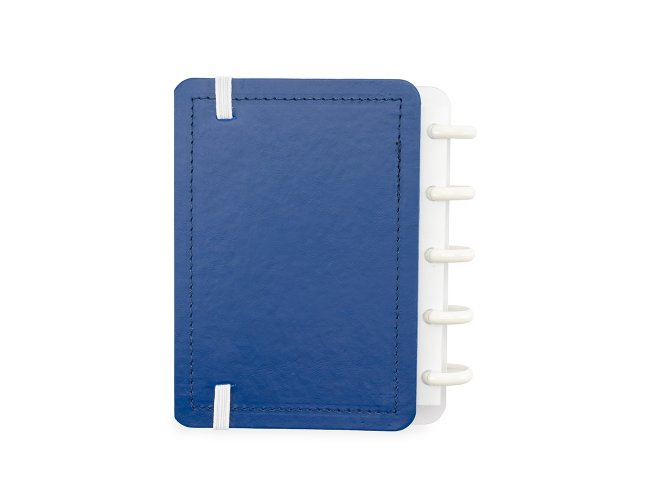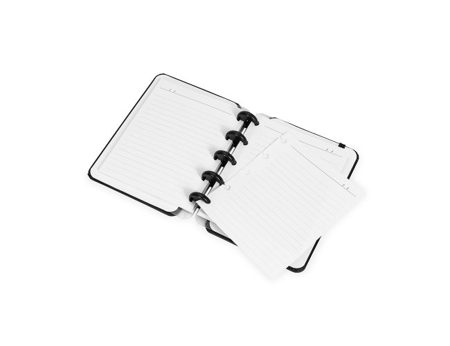Caderno de capa dura em percalux, com fechamento em elástico e encadernação em discos plásticos reposicionáveis, que permitem adicionar ou retirar folhas compatíveis. Inclui páginas para dados pessoais, calendários de 2025 a 2027, datas importantes, planejamento trimestral e uma página com instruções para troca de folhas. Conta ainda com aproximadamente 62 folhas pautadas brancas.