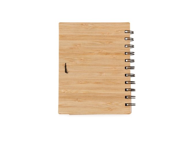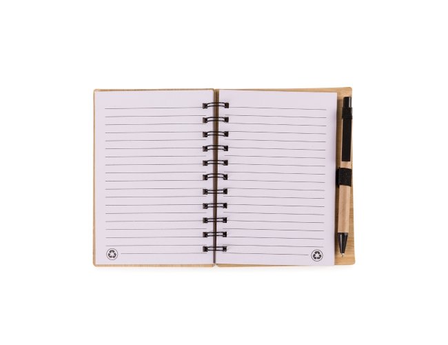 Caderno ecológico com caneta. Capa de papelão com folha de bambu e uma faixa preta no lado esquerdo da capa e verso liso. Possui aproximadamente 70 folhas brancas pautadas com logo reciclado na lateral inferior. Acompanha suporte elástico de nylon com uma caneta de papelão de detalhes plásticos.
