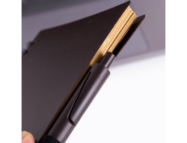 Caderno ecológico com caneta plástica: bloco de anotações com elástico e suporte para caneta, produzido com grãos de café e polipropileno, aproximadamente 70 folhas com pauta, caneta plástica com acionamento por clique.