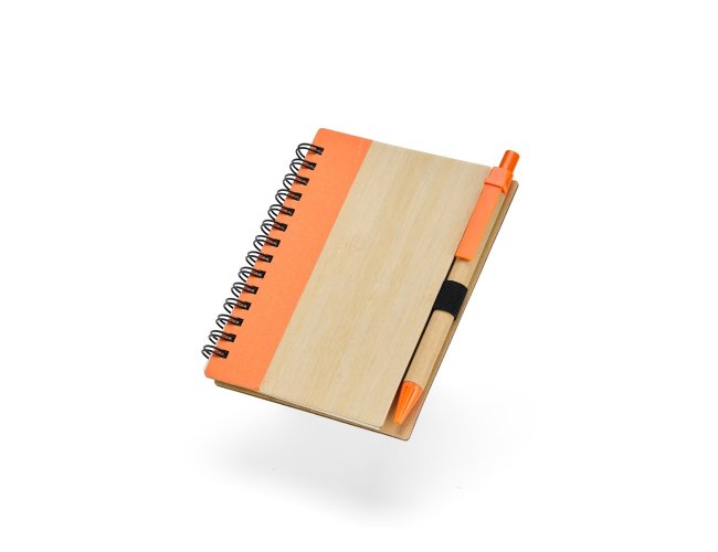 Um caderno feito para quem deseja anotar ideias e projetos sem abandonar a preocupação com o meio ambiente. Com capa feita em casca de bambu e faixa vertical colorida, ele conta também com encadernação Wire-O e aproximadamente 70 folhas amareladas pautadas. Além disso, o caderno acompanha uma caneta esferográfica de carga azul de 0,8 mm com corpo em papelão e clip, acionamento em clique e ponteira em plástico. A capa contém um elástico para abrigar a caneta junto ao caderno.