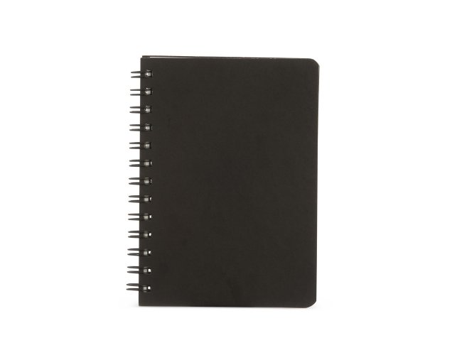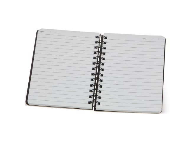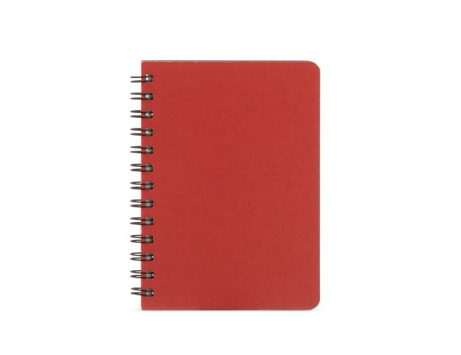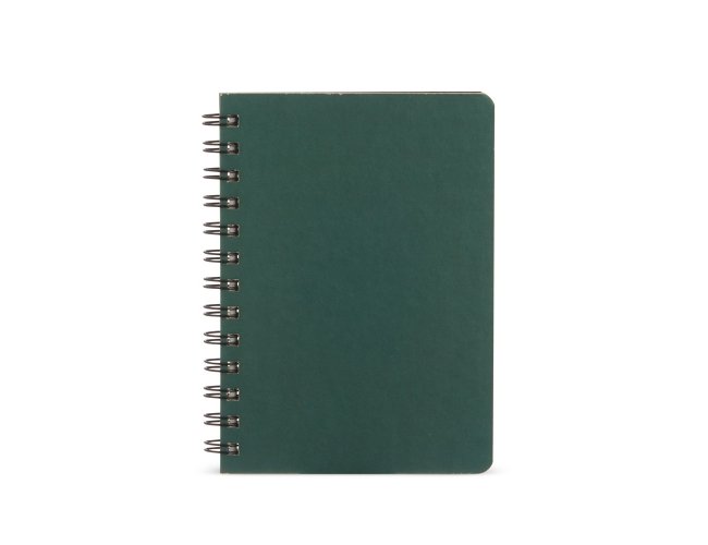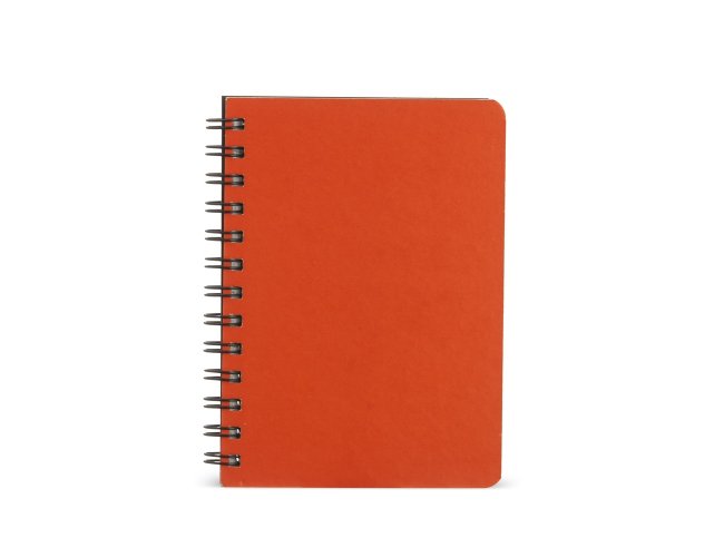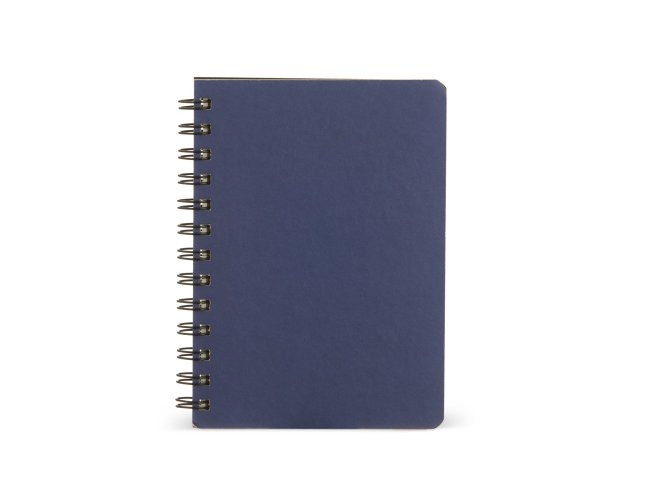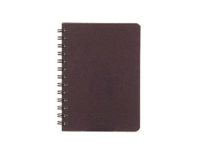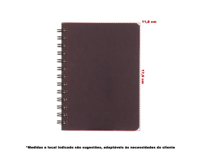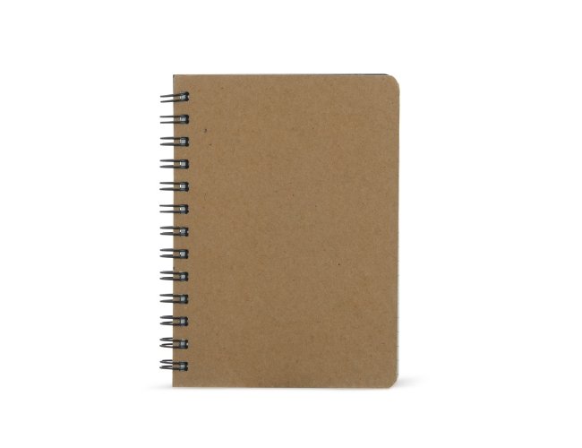 Caderno capa dura em kraft com wire-o. Contém aproximadamente 80 folhas brancas pautadas.