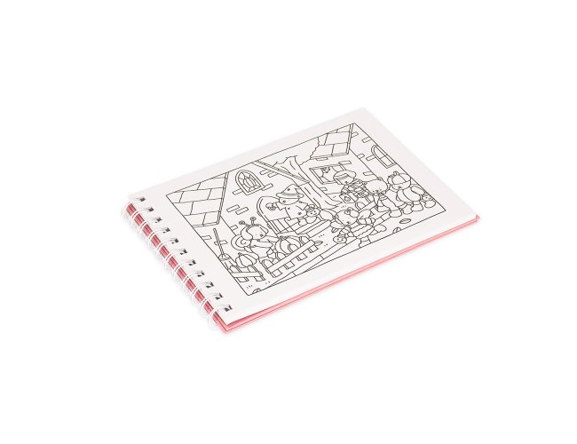 Caderno de colorir de capa dura com laminação holográfica e encadernação Wire-O. Possui aproximadamente 48 folhas contendo ilustrações de capivara e outros animais em situações leves e divertidas. Acompanha uma folha protetora destacável em acetato.