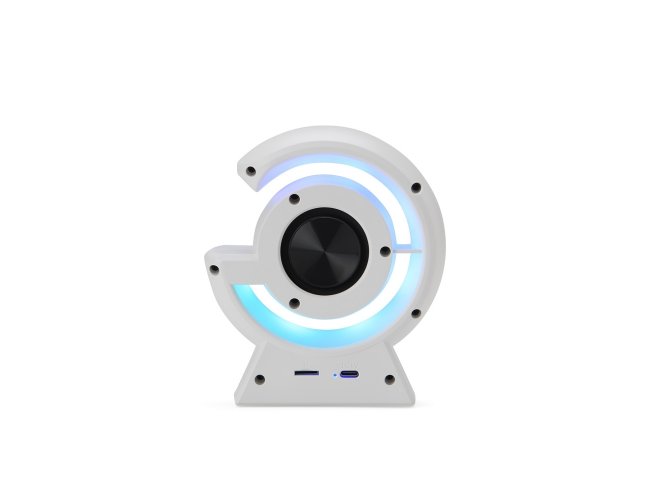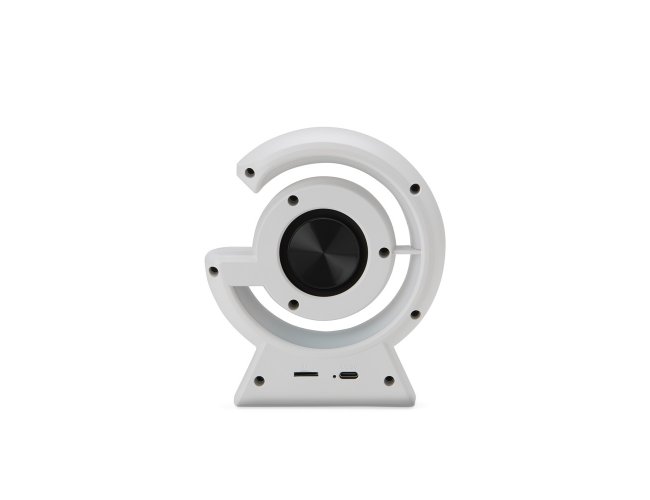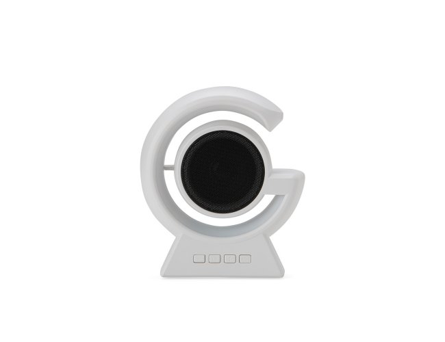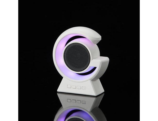 Caixa de som com luminária. Possui 8 modos de iluminação, opera nos modos bluetooth, rádio FM e TF (cartão MicroSD).