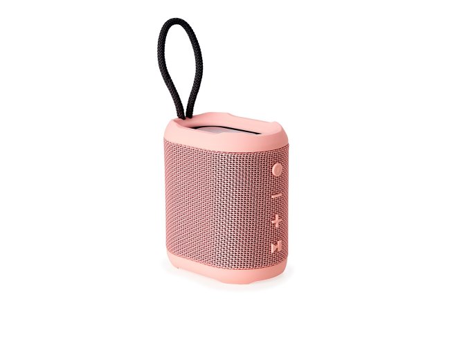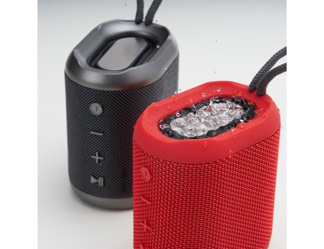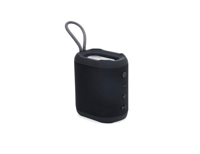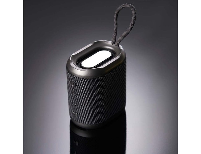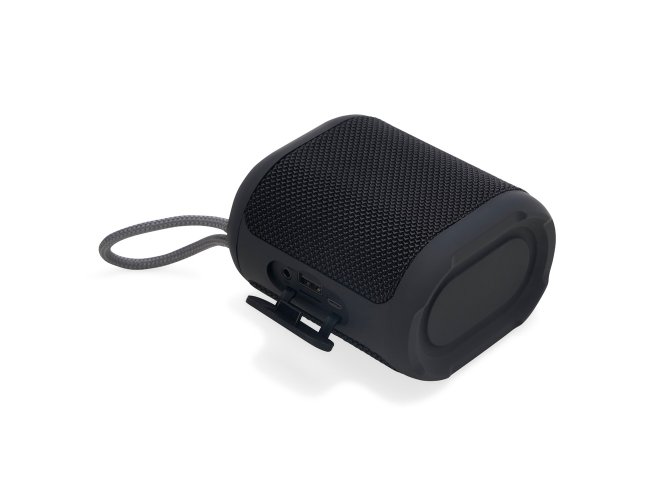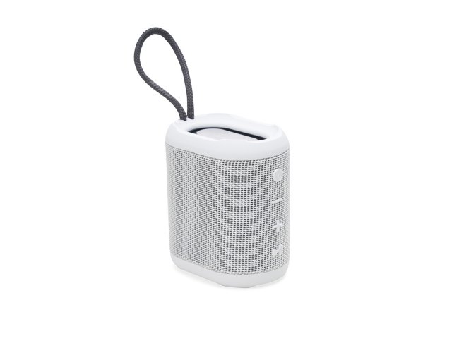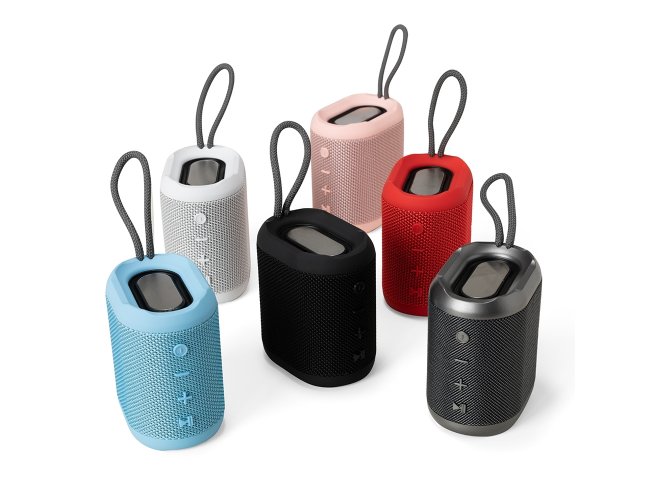 Caixa de som multimídia. Material plástico resistente a água, e falantes com acabamento em tecido, possui um cordão de nylon acoplado para facilitar o transporte. A caixinha funciona nos modos Bluetooth, Radio FM, Cartão TF (Micro SD), Auxiliar e USB. Possui bateria de longa duração, com autonomia de aproximadamente 35 horas continuas de reprodução. É possível emparelhar 2 caixinhas do mesmo modelo e executar o som sincronizado em ambas. Acompanha cabo USB e cabo auxiliar P2