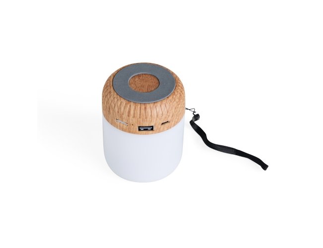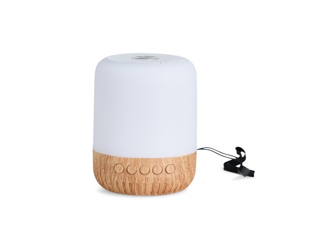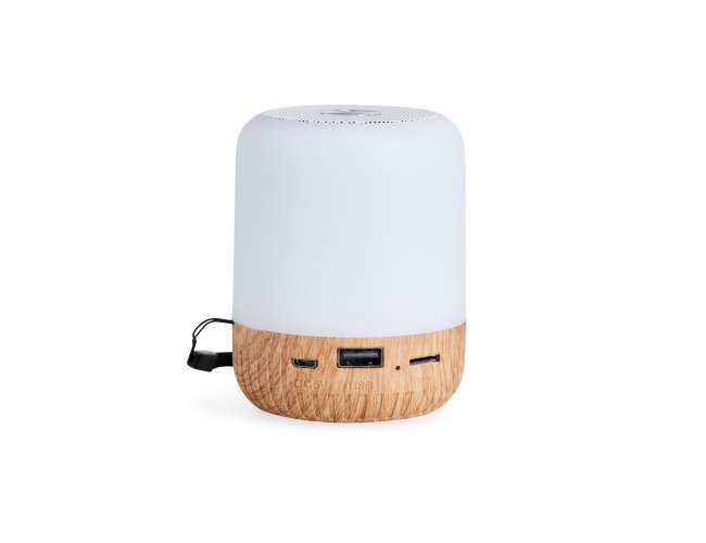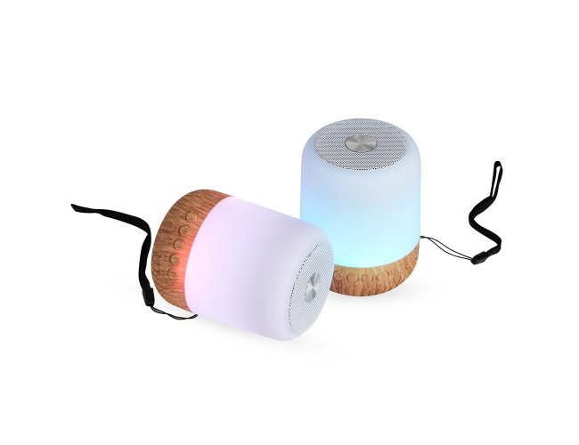 Caixa de som multimídia com luzes, material plástico. Operante nos modos Bluetooth, rádio FM, pen drive e cartão TF (MicroSD). Base antiderrapante. Acompanha cabo USB e cordão de nylon.