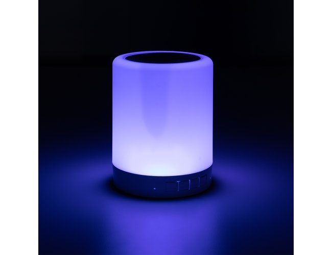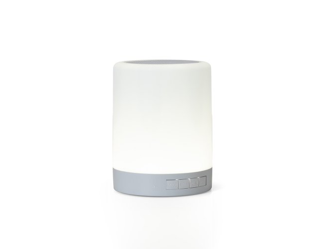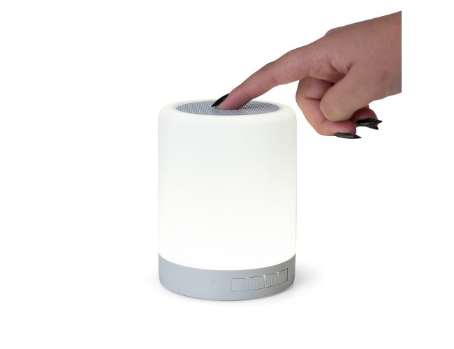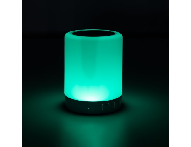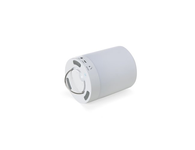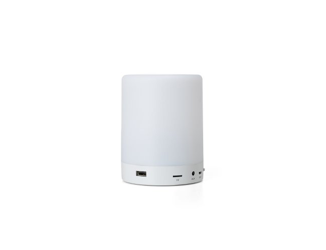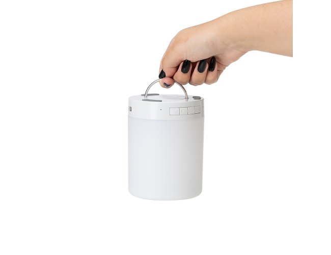 Caixa de som multimídia com luzes. Material plástico resistente na cor branca fosca, parte superior com falante e sensor touch para troca de luzes. Parte inferior branca leitosa, base com EVA antideslizante e alça de alumínio para transporte. A caixinha executa nos modos Bluetooth, rádio FM, auxiliar e cartão TF (MicroSD). Acompanha cabo USB e cabo Auxiliar (P2).