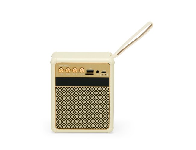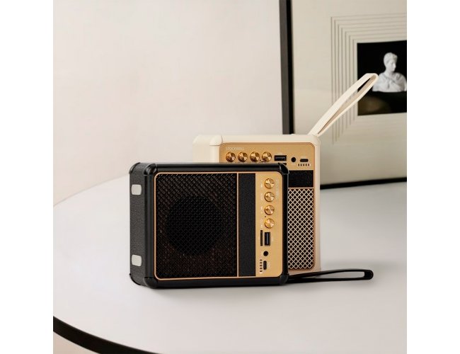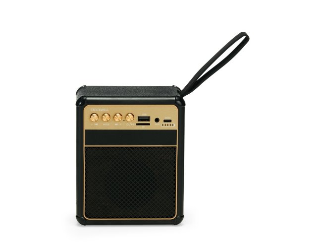 Caixa de som multimídia Bluetooth em plástico e metal, com design inspirado em amplificadores de guitarra, alça de mão e base em silicone. Conta com bateria de até 20 horas de duração, conexão Bluetooth, rádio FM, painel frontal com botões e indicador de bateria, além de porta USB-C para carregamento. Dispõe ainda de porta USB-A e slot para cartão MicroSD, permitindo reprodução de músicas em MP3. Acompanha cabo USB-C.