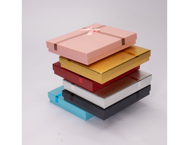 Caixa para presente feita em papelão com acabamento levemente texturizado e laço decorativo colado diretamente na tampa. Conta ainda com berço removível em espuma com ranhuras.