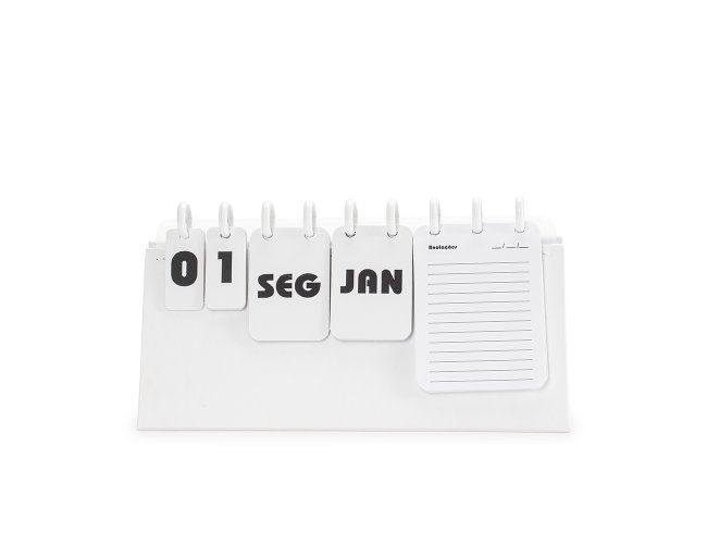 Calendário permanente de mesa com base em percalux e encadernação em discos plásticos reposicionáveis. Inclui fichas para marcação dos dias do mês em números, do dia da semana em texto e do mês também em texto, além de um bloco de anotações com cerca de 30 folhas brancas pautadas.