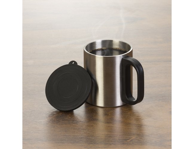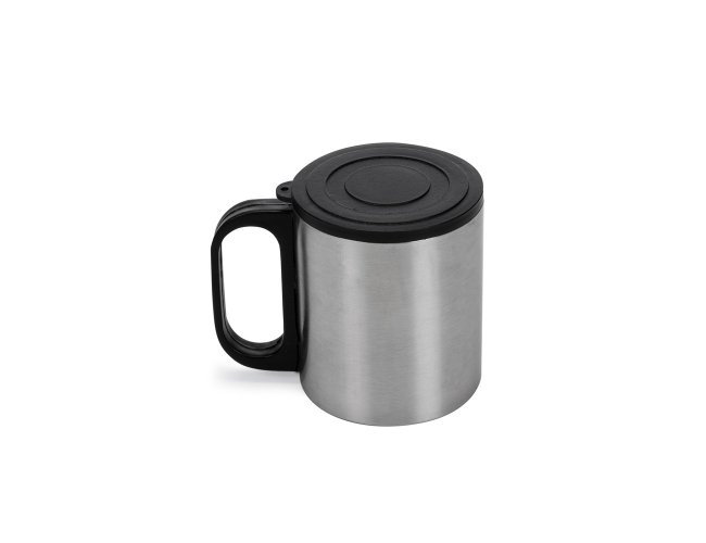 Caneca de inox 180ml com cabo e tampa em plástico resistente (não é térmica).
