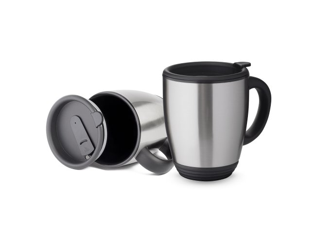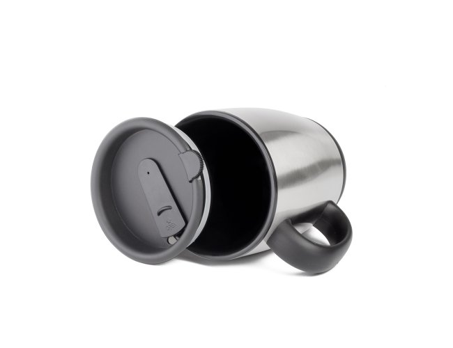 Caneca em inox de 470ml. Possui tampa com vedação, bocal com trava de segurança e pegador de plástico.