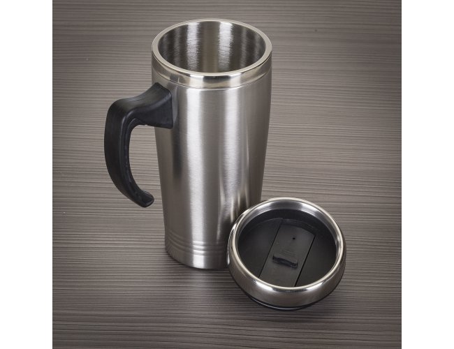 Caneca inox de 450ml, pegador de plástico e parte interna em inox. Possui tampa com compartimento que pode ser aberto para beber(não é térmica).