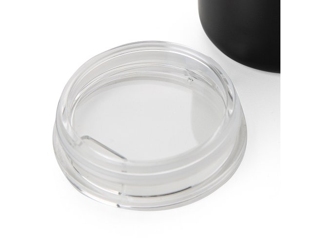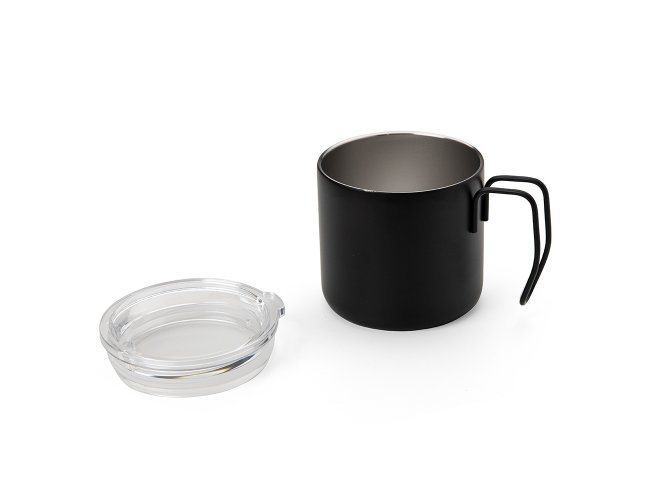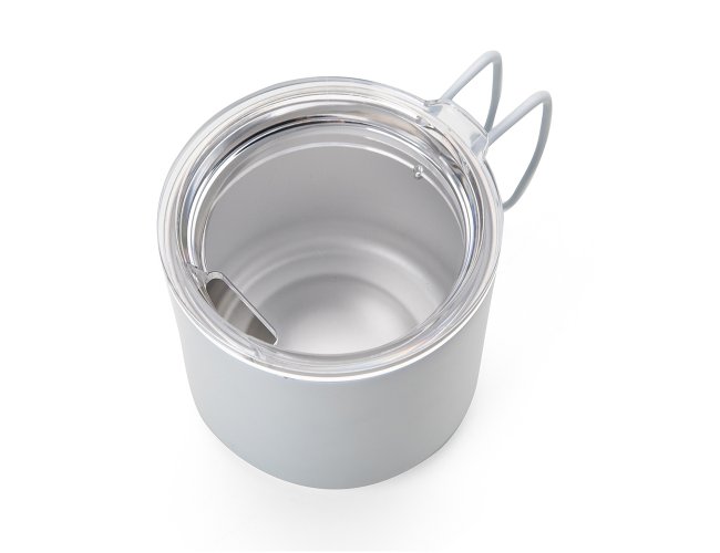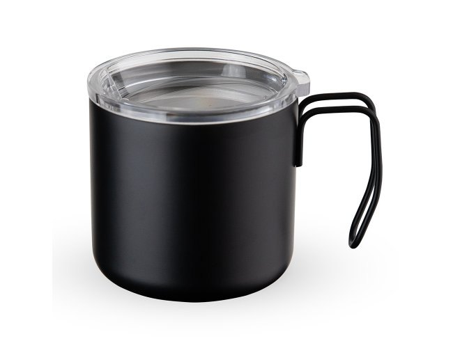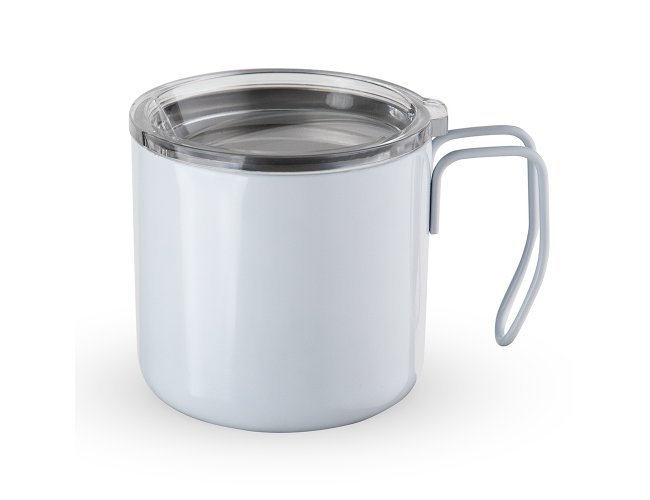 Caneca 350ml parede dupla em Inox, com pegador de inox, contém tampa transparente com compartimento para beber.
