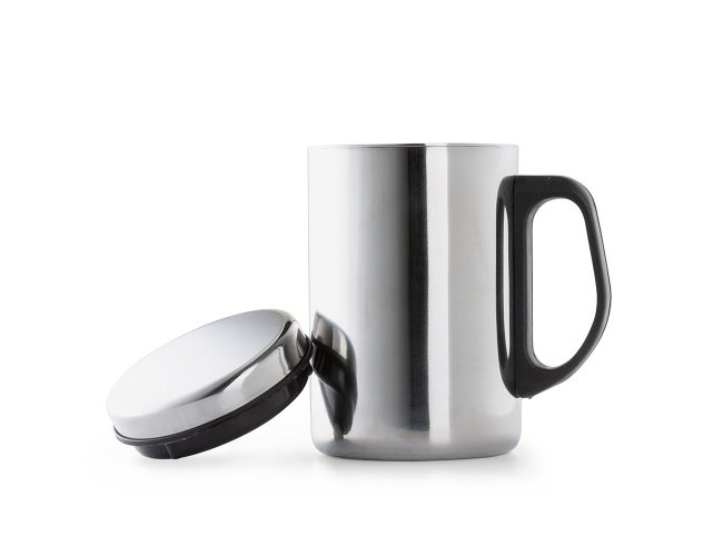 Caneca 350ml inox com parede dupla, possui tampa com vedação e pegador plástico (não é térmica).