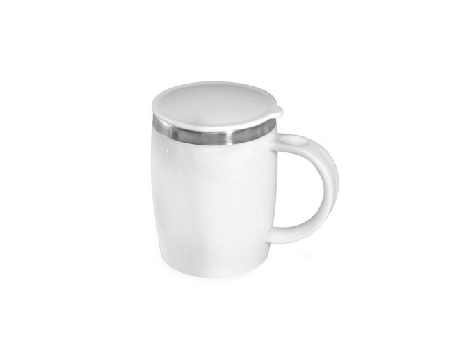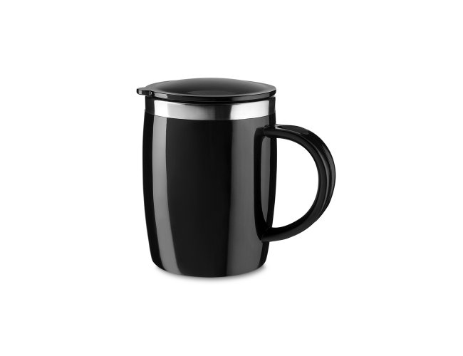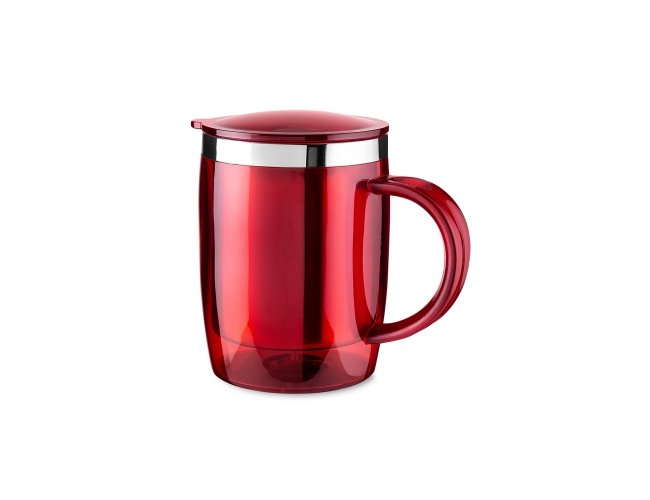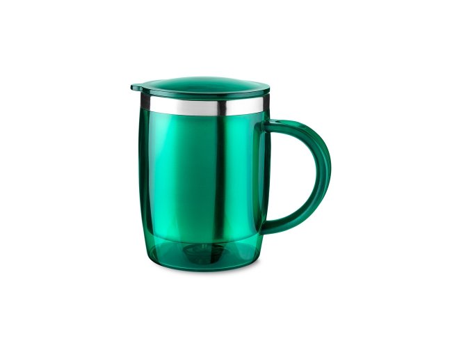 Caneca plástica com área interna de inox, capacidade de 400ml. A caneca possui tampa de encaixe com borracha de vedação e ?tapete? antiderrapante na área inferior.