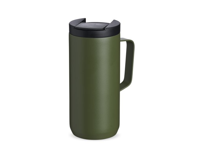 Caneca térmica de inox em parede dupla livre de BPA, capacidade de 350ml. Contém base antiderrapante e tampa plástica com bocal e trava de segurança.