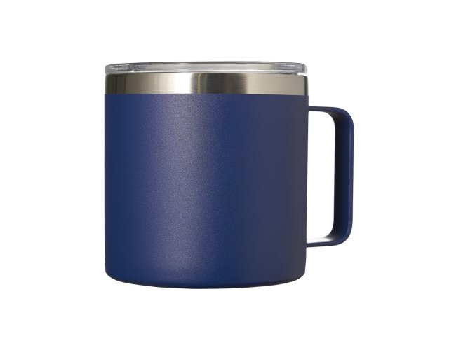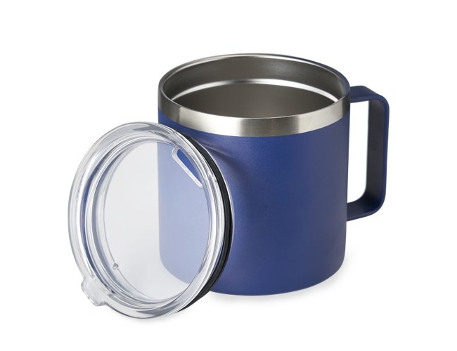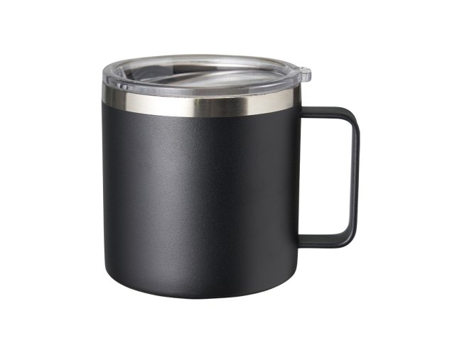 Caneca térmica de inox 450ml com parede dupla e tampa com acesso ao bocal.