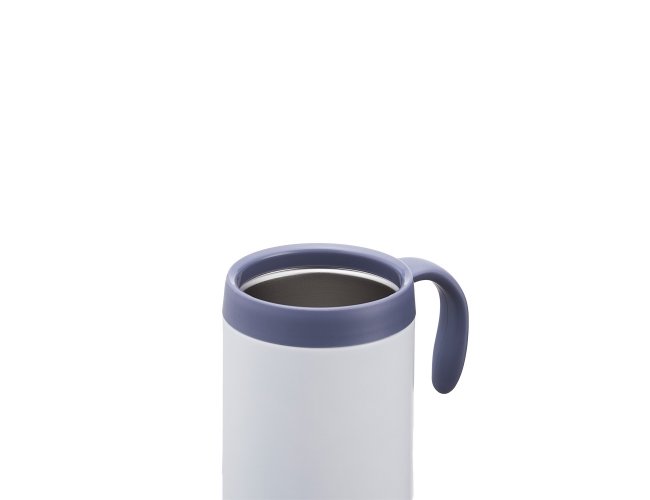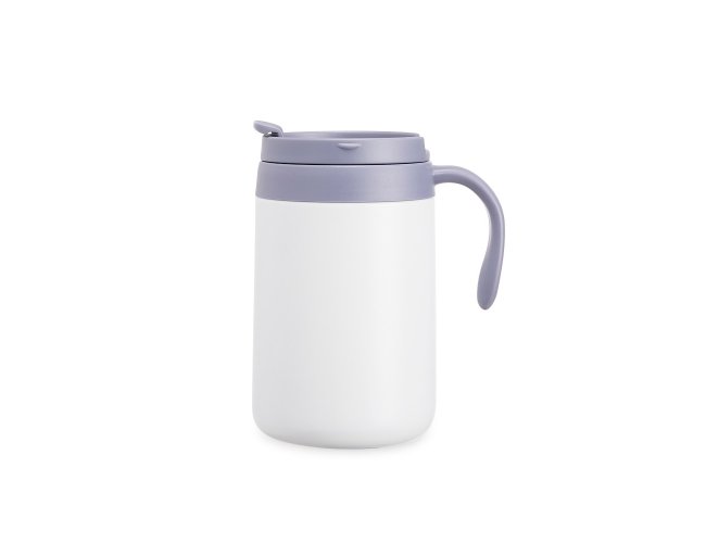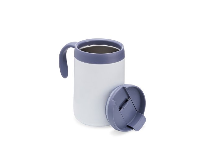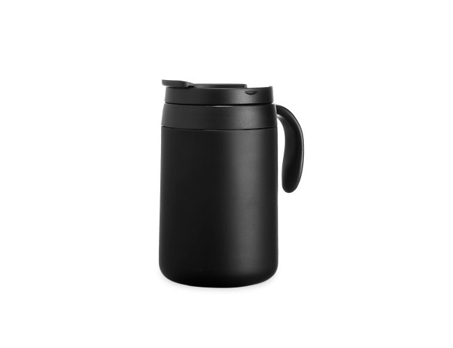 Caneca térmica feita em inox 304 com parede dupla, capacidade de 500ml. Contém tampa com acesso para o bocal, alça plástica e base antiderrapante.